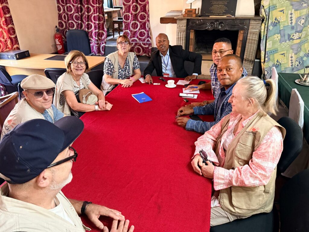 De gauche à droite :Mireille : dermatologue 🧑⚕️ Bernard : médecin généraliste 👨🏼⚕️ Valérie : chef de mission 👮 Annie : dermatologue 👩⚕️ Benjamin : accompagnant 🛠️